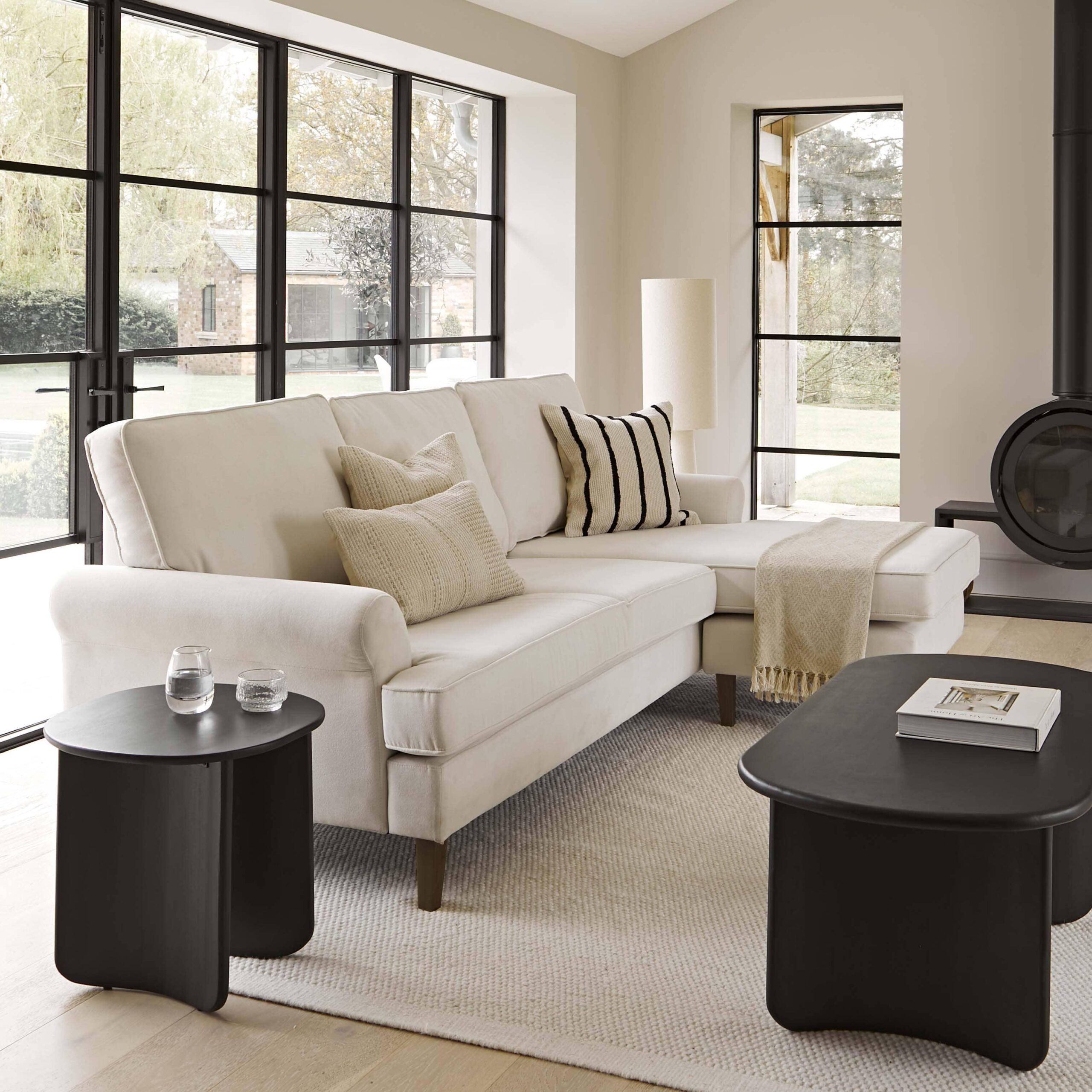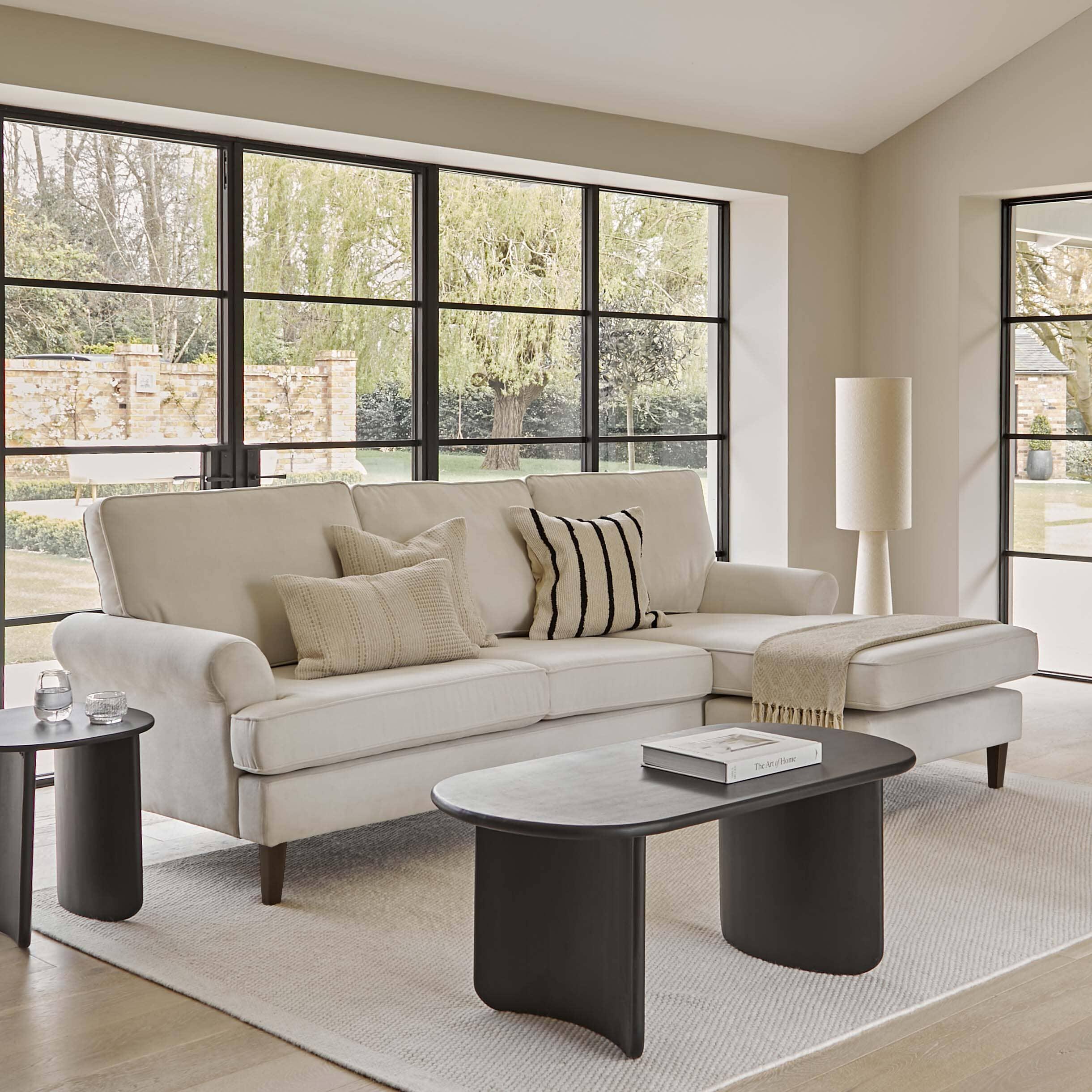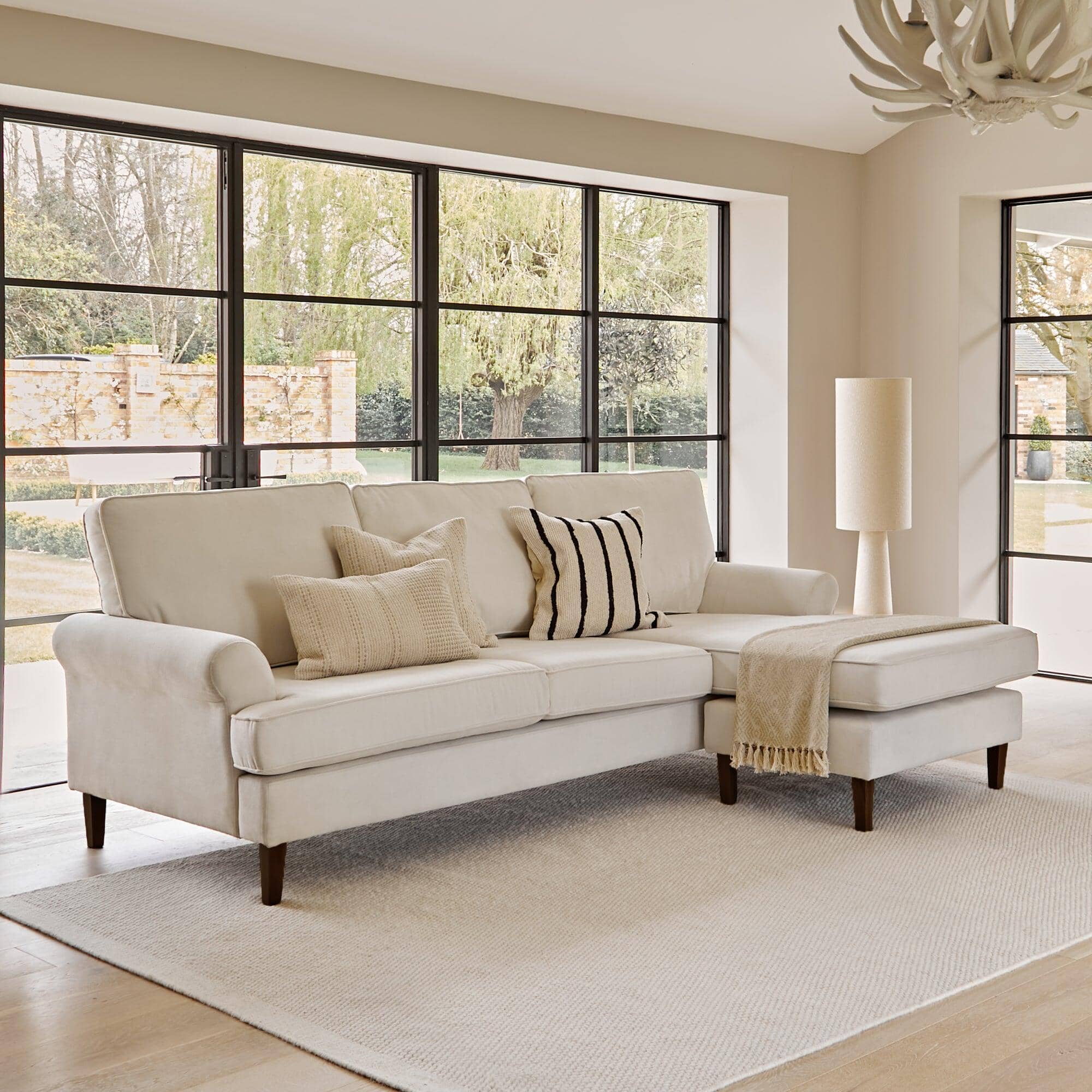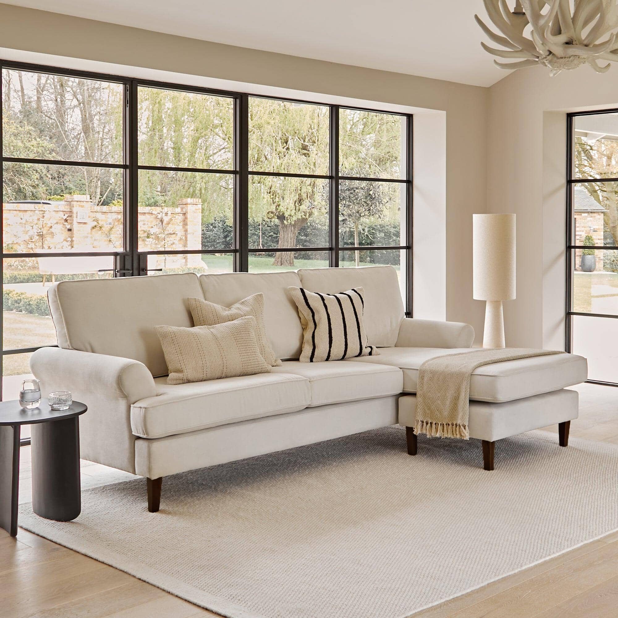The Annabelle corner chaise sofa in natural ivory is a harmonious blend of style, comfort, and practicality for your living space. Whether hosting an intimate gathering or unwinding with the family, this sofa becomes the focal point of relaxation. Its inviting natural ivory hue effortlessly complements various interior styles, offering a versatile canvas for personalisation. In need of inspiration? style with our burnt orange throws and cushions from a SS24 range. Simply sink in and unwind, as this sofa becomes the perfect cosy lounge spot to your living area.