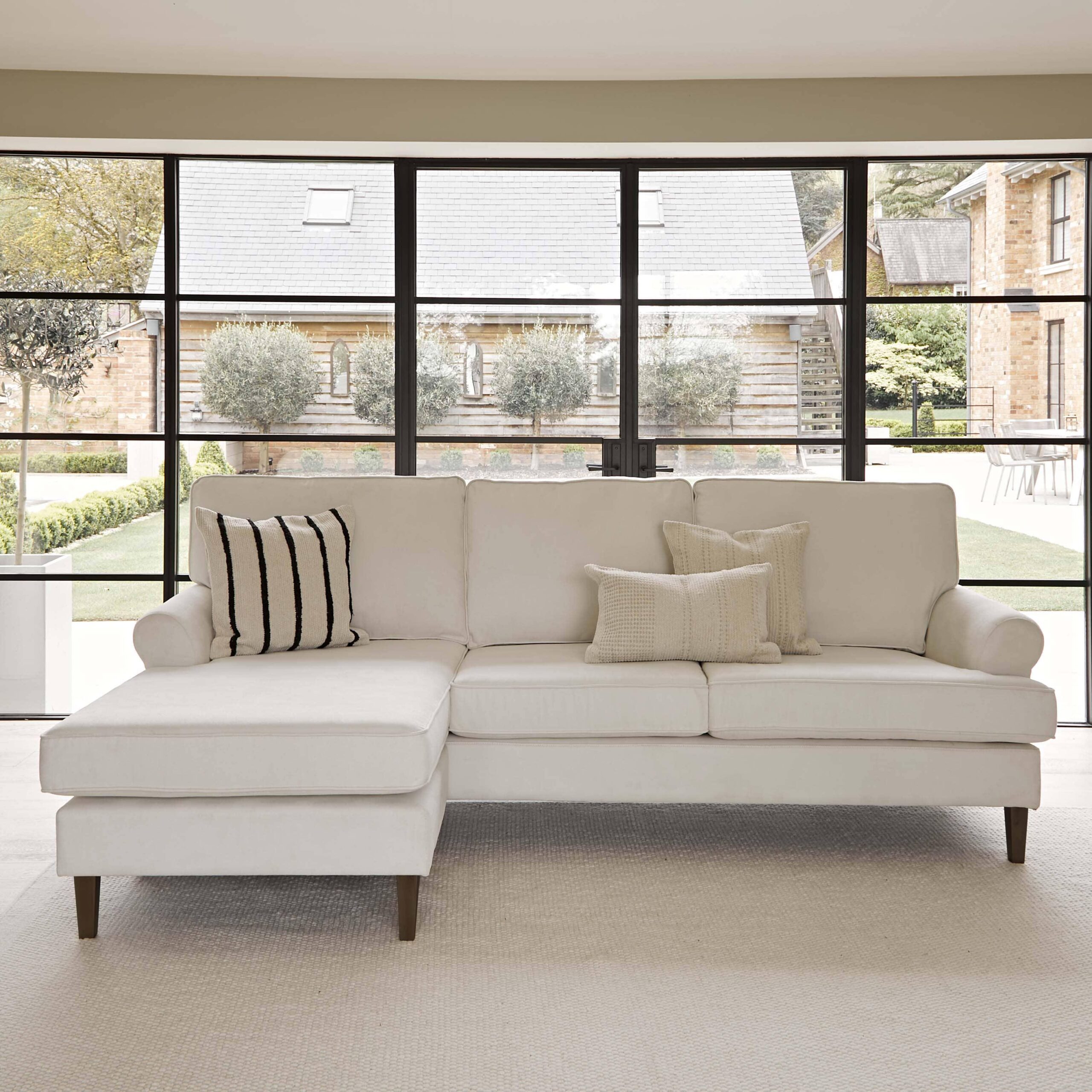 Introducing the Annabelle natural ivory chaise sofa, a stylish design featuring contemporary woven upholstery and a blend of foam and fibre filled cushions. The Annabelle, with its interchangeable left and right configuration, seamlessly shapes into the perfect L-shaped sofa for any home.