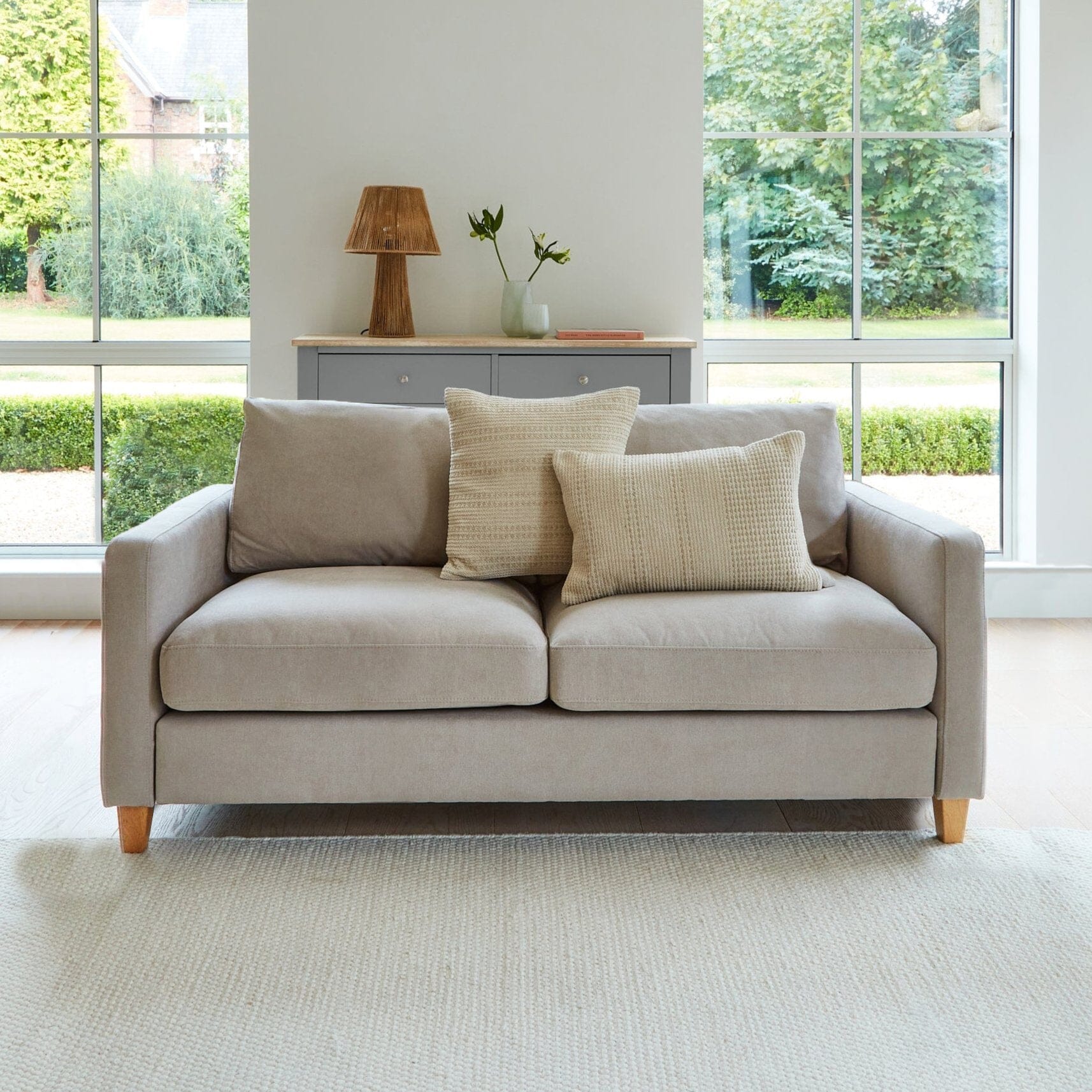 Our Ava 2-seater sofa is now available with refreshed fabrics and leg options. This soft beige snug sofa is made from a brushed weave fabric, paired with pale oak legs, creating a beautifully modern seating option for your living room. Additionally, Ava is made with a low back and deep seat cushions, forming a highly comfortable 2-seater fabric sofa, perfect for contemporary homes.